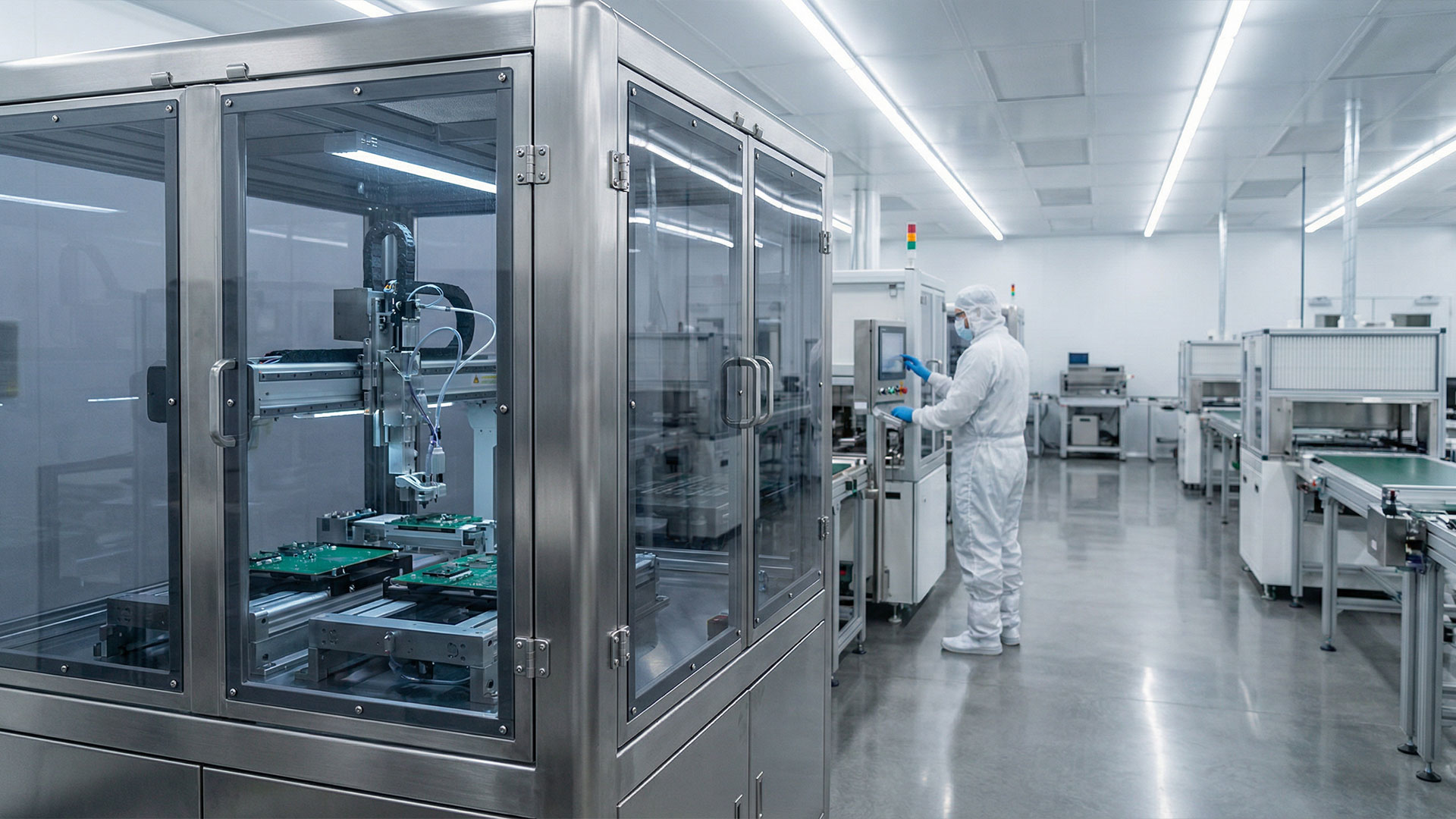 Ein wichtiger Bereich ist die Elektronik- und Halbleiterfertigung. Hier werden ESD-Polycarbonatplatten häufig als Sichtfenster in Maschinen, als Abdeckungen für Förderanlagen oder als Bestandteil sogenannter Mini-Environments eingesetzt. Diese geschlossenen Arbeitsbereiche schützen sensible Bauteile vor Partikeln und elektrostatischen Einflüssen.