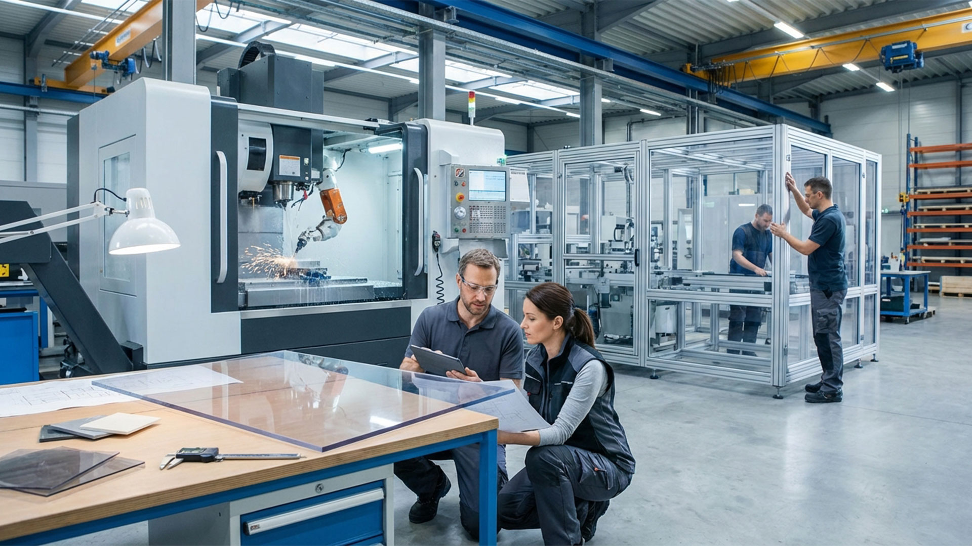 Auch im Maschinenbau spielt der Werkstoff eine wichtige Rolle. Maschinenverkleidungen oder Schutzfenster müssen nicht nur transparent und stabil sein, sondern auch elektrostatische Aufladung vermeiden. ESD-Polycarbonat ermöglicht diese Kombination und kann gleichzeitig individuell bearbeitet werden.